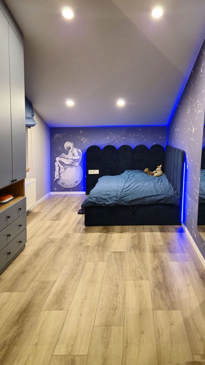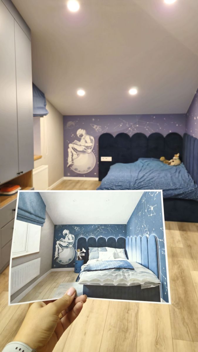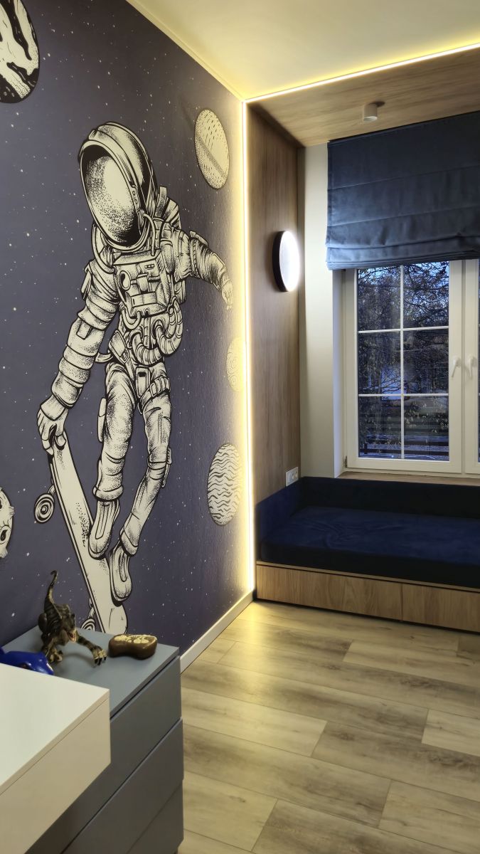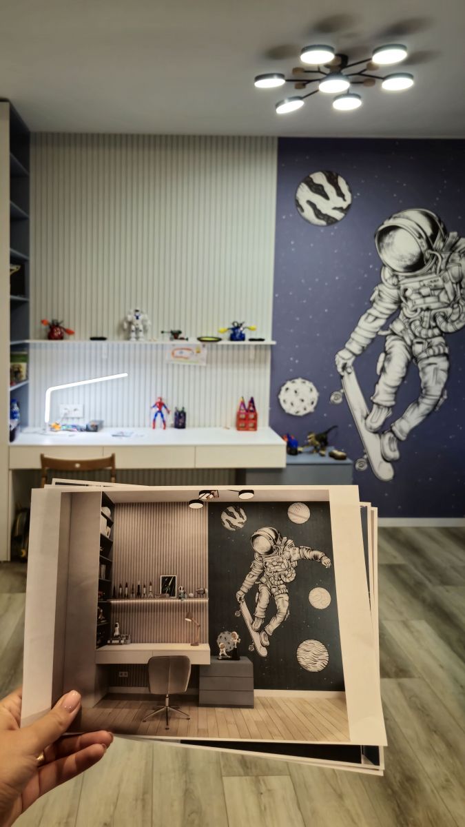Оформление детской бесшовными обоями ECO от ОРТОГРАФ – это трамплин в будущее, украшенный амбициями. Сюжет с космонавтами шепчет: «Не бойся мечтать о большем, загляни за горизонт, увидь звезды!» А дети ведь так восприимчивы к окружающему миру! Они впитывают информацию как губки и формируют свое мировоззрение на основе того, что видят вокруг. Поэтому так важно окружить их красотой со смыслом и вдохновением. Такое оформление станет частью их растущего сознания, подталкивая к новым знаниям и открытиям!