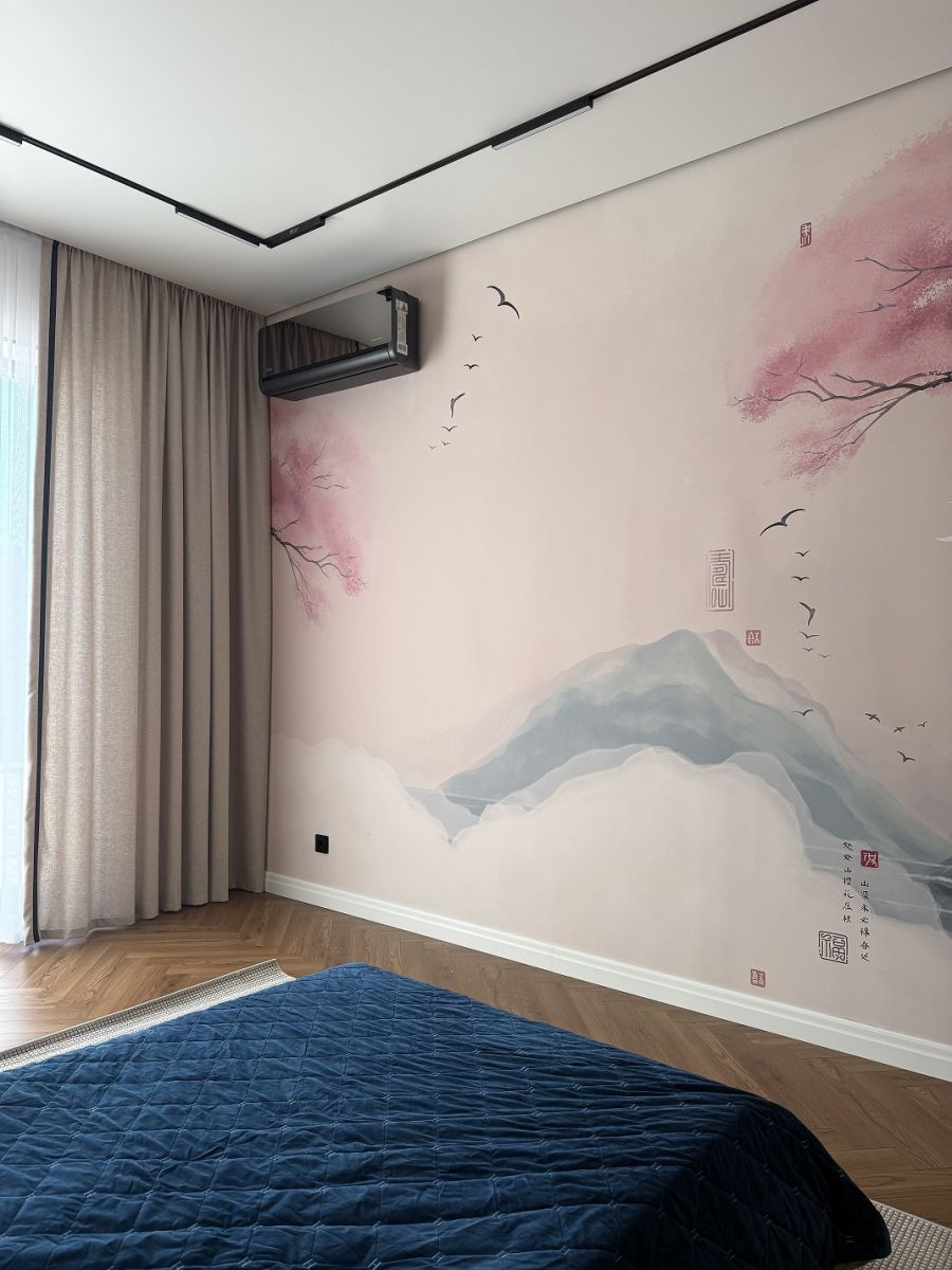 В соседней комнате раскрывается другая грань красоты - японский пейзаж с изящными силуэтами гор, с его спокойствием и глубиной, который приглашает к созерцанию. Получилось пространство, где каждый может найти свой собственный дзен –  будь то в нежном цветочном очаровании или в безмолвном величии природы!